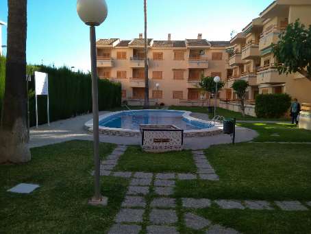 Zonas ajardinadas y piscina comunitaria con fácil aparcamiento.