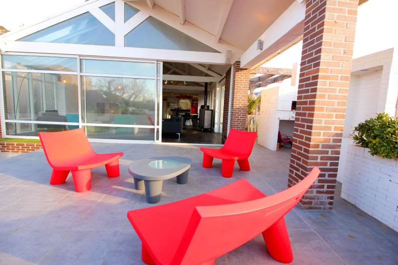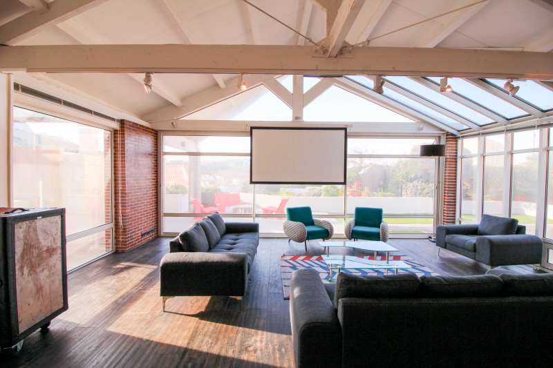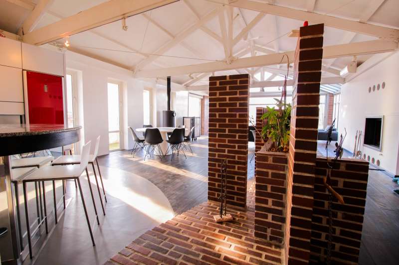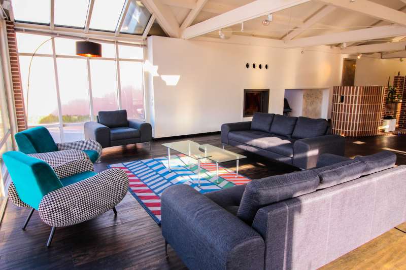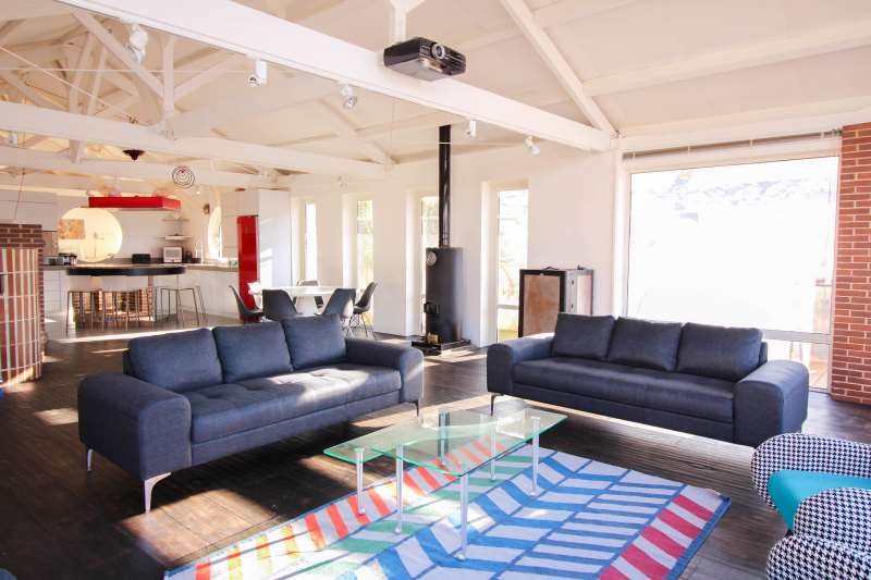 - A beautiful and bright living room with two sofas, three armchairs, a coffee table, a wood stove and a fireplace (decoration), a video-projector and a dining table for 8 people.