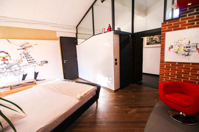 - A first warm and large bedroom decorated with a big artist's canvas and a magnificent wooden floor. It is composed of :