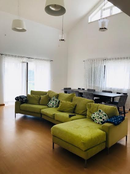 The house has four bedrooms, three bathrooms, an open space and a huge balcony, an area spread over 3 floors. The kitchen and the living room are also lovely! Your car can be parked in our garage.