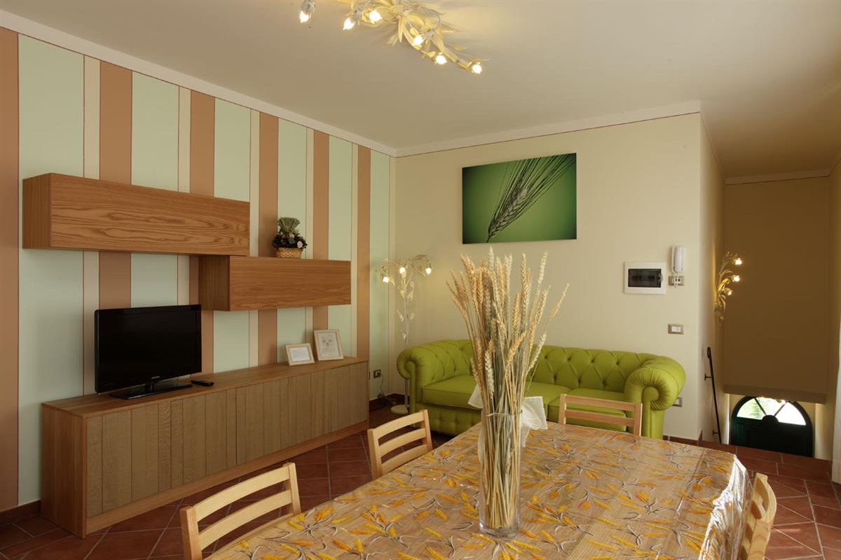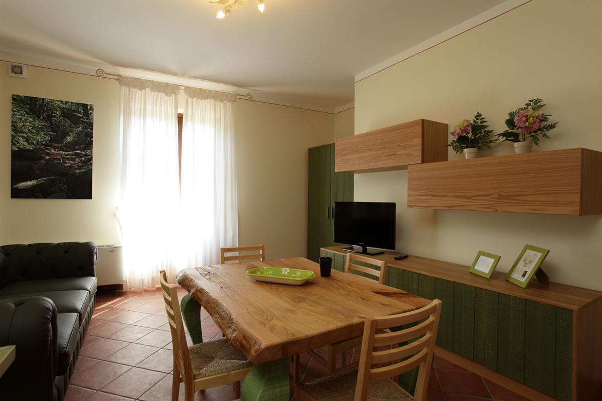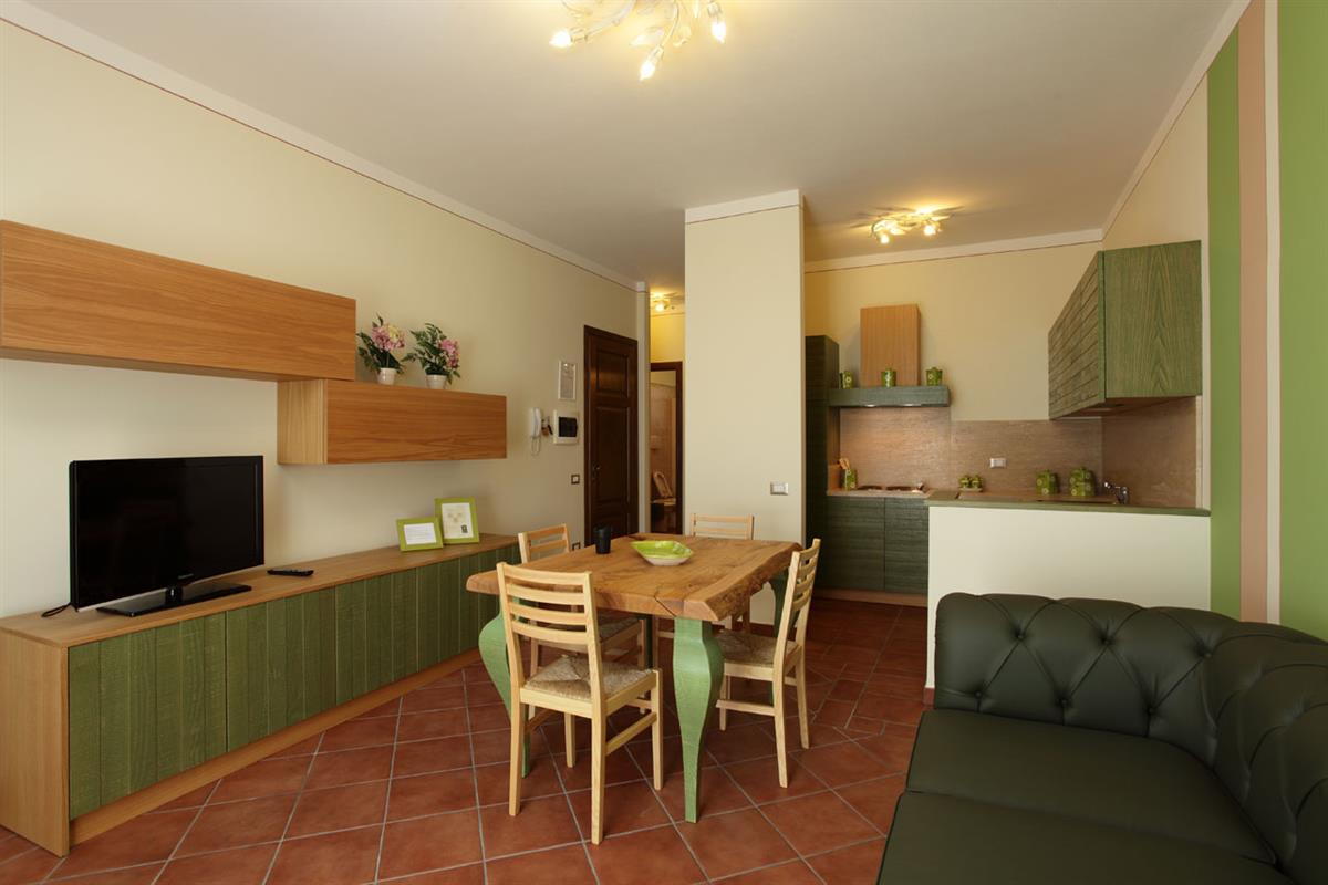 The green tones of field and woodland are everywhere inside the apartment Fern, on the first floor and complete with a kitchen-living area with TV and double sofa-bed, a double room with TV and a bathroom. From the balcony you can catch striking glimpses of Tuscan countryside.