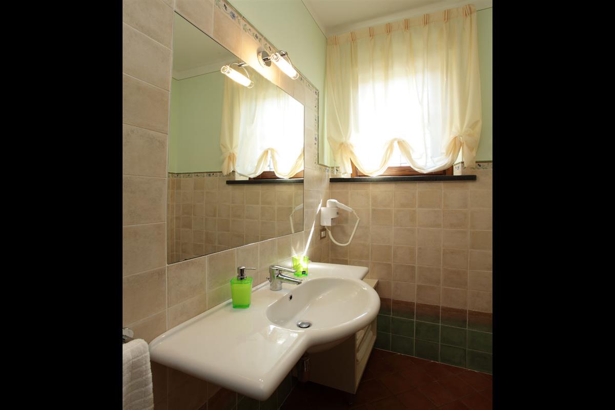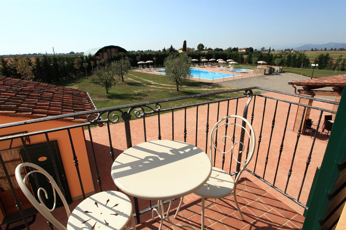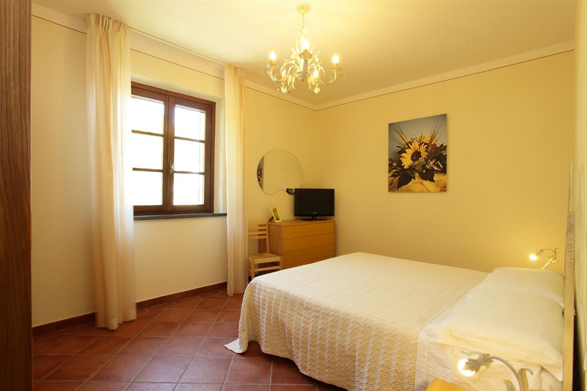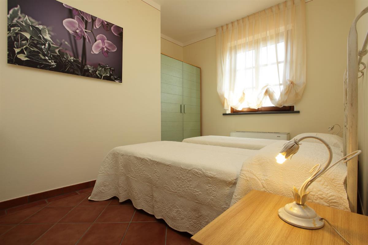 Located on the first floor and complete with balcony, this apartment shows the original characteristics of a Tuscan farmhouse with the large archway opening onto the kitchen area. The adjacent living room is furnished with a double sofa-bed and TV. The rest of the apartment is made up of a bathroom, a double room with TV and a twin room (the beds can be joined together to form a double). The kitchen has a dishwasher and, at night, the sight of the illuminated swimming pool.