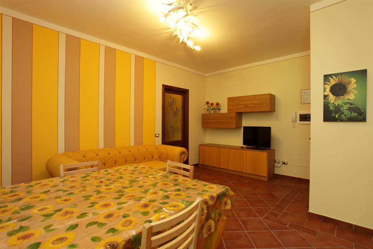 A lively and typically sunny character distinguish this first floor apartment. The bright yellow colour which brings to mind the golden mane of ripe sunflowers puts you in good spirits in every one of the various rooms: the kitchen-living area with double sofa-bed and TV, the double bedroom with TV and the bathroom.