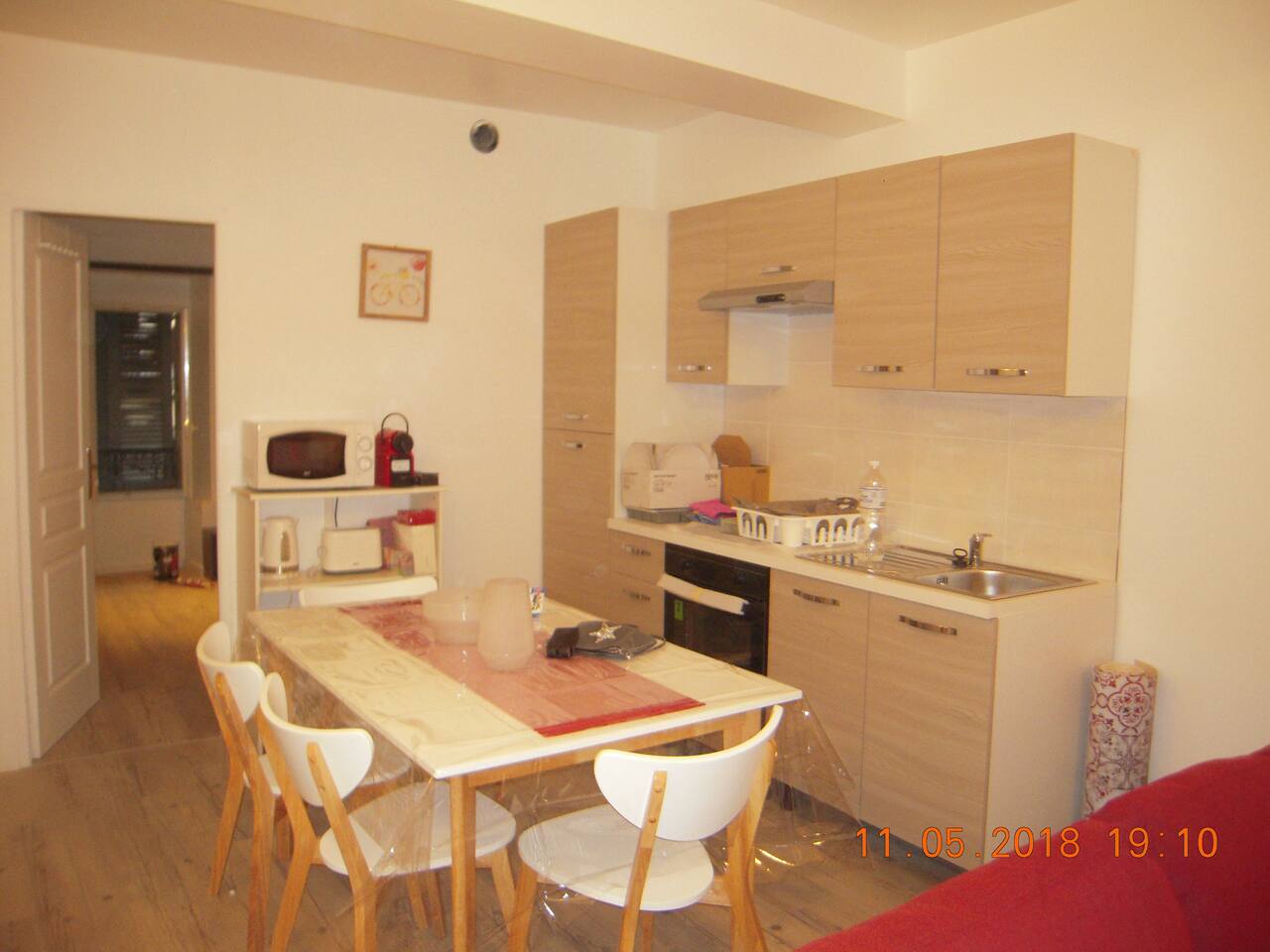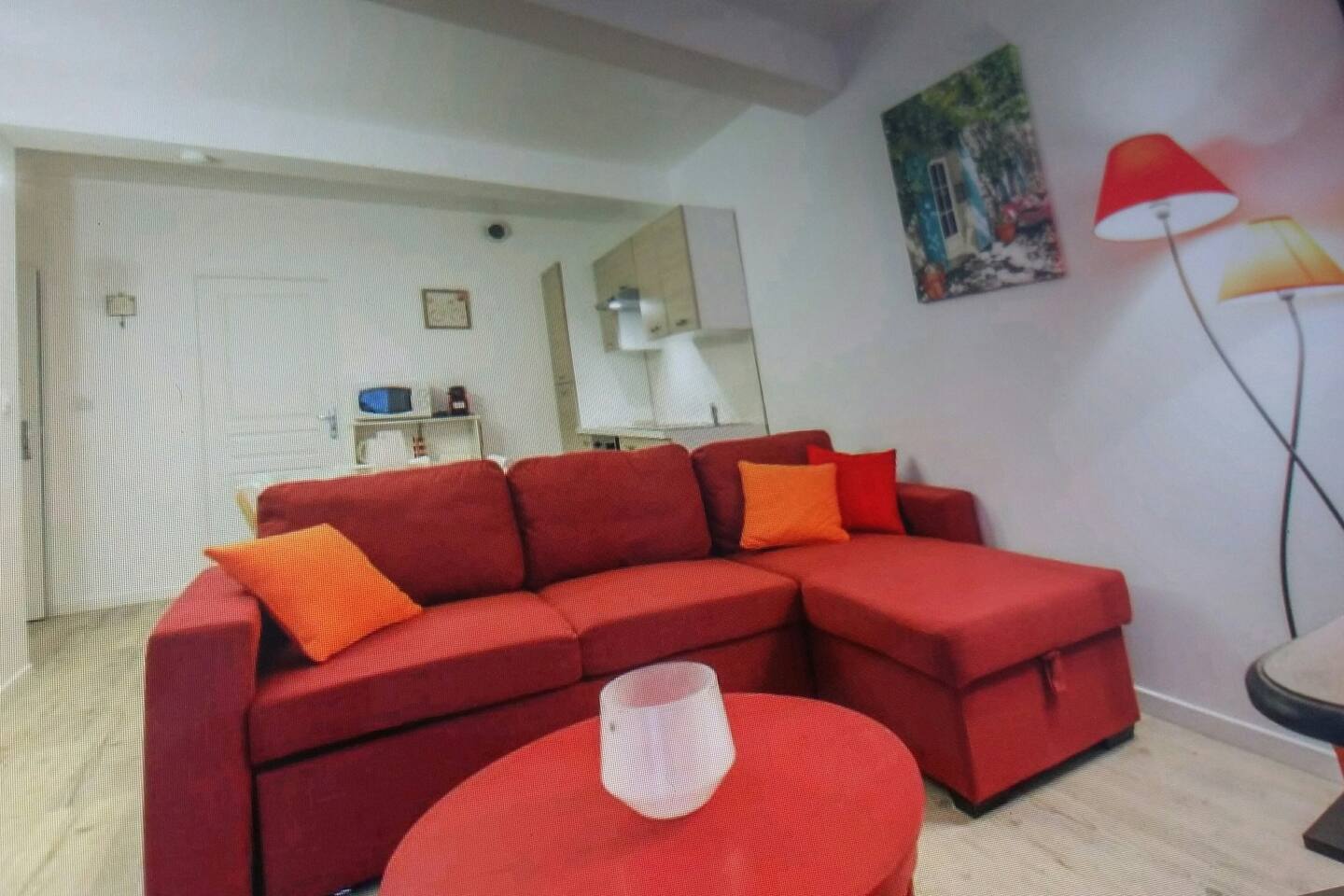 MAIN ROOM: Kitchen open to dining room. Fully equipped. Oven. Fridge Freezer.Nespresso coffee machine. Microwave. Toaster, kettle and all for cooking, crockery. A large convertible corner sofa, occasional sleeping, delimits the living room with coffee table. Baroque style chest of drawers, embellished with a beautiful floor lamp with shimmering brightness next to it. TV80CM .Box .160 TV channels and internet. A window overlooking pedestrian street, rue de Sault.