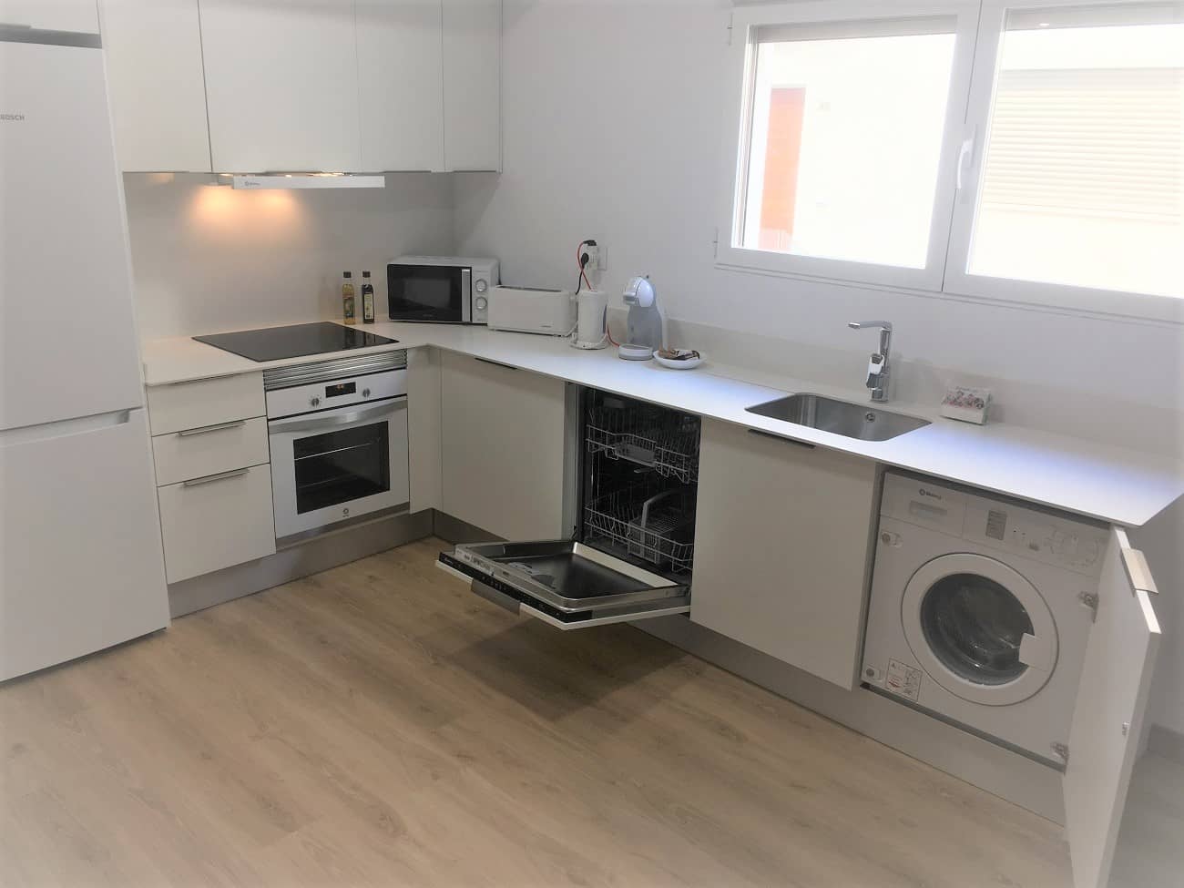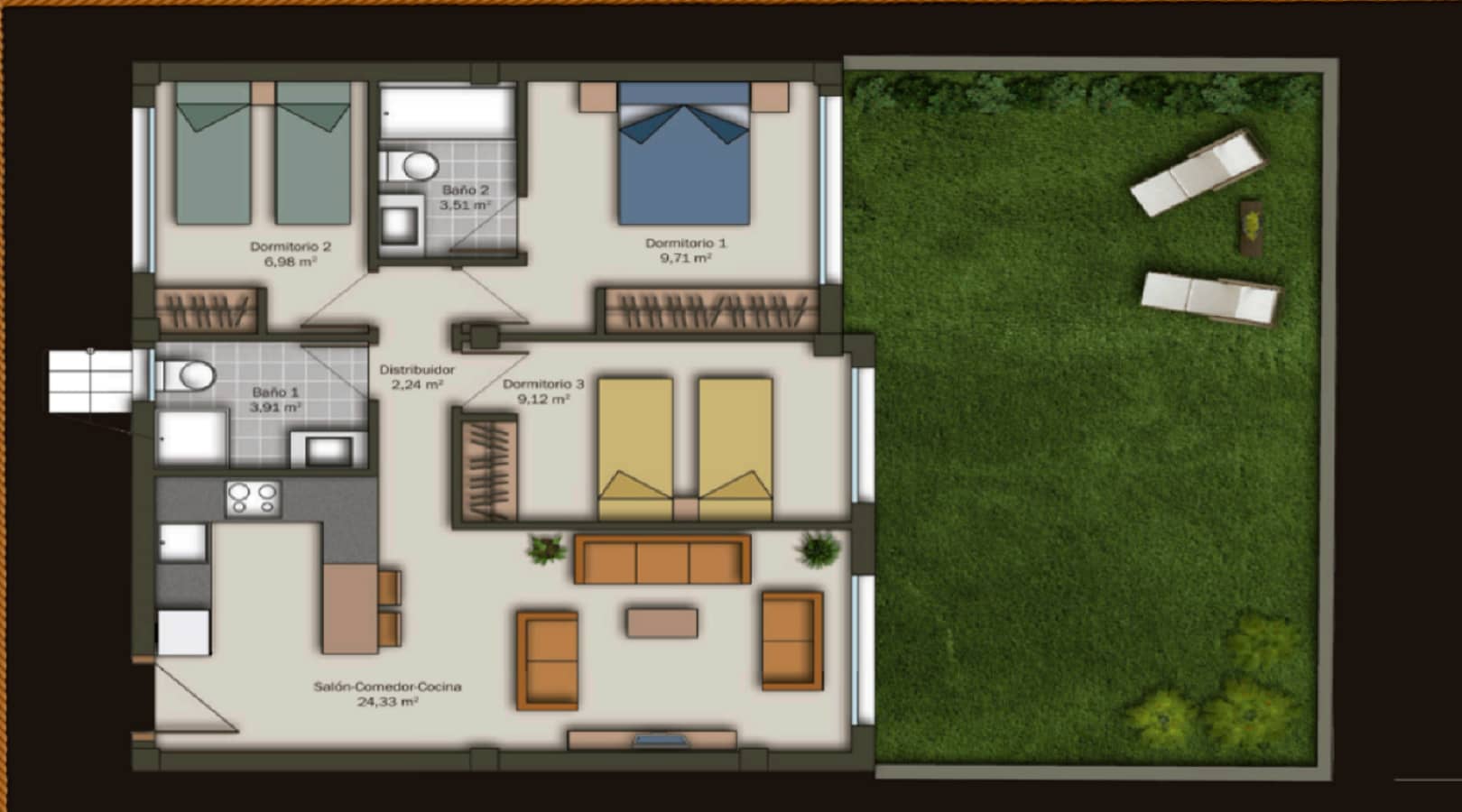 Apartamento en planta baja con jardin privado, Tiene tres habitaciones y dos baños con ducha, Aire Acondicionado: Aire Acondicionado:: Además FRIO Y CALOR, gratis wifi, todos los electrodomesticos y Cuenta con garaje Dentro de la propiedad.