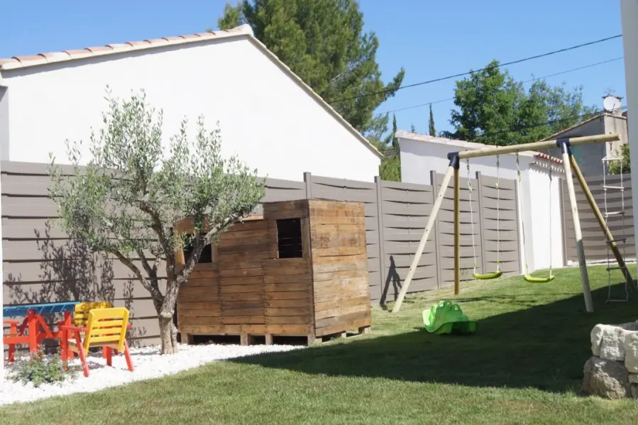 Terrain de 1200 m2 avec piscine sécurisée par un abri Faible, un terrain de pétanque et un espace enfants et Avec balançoire Cabane.