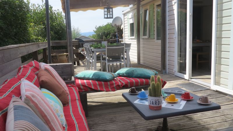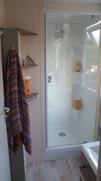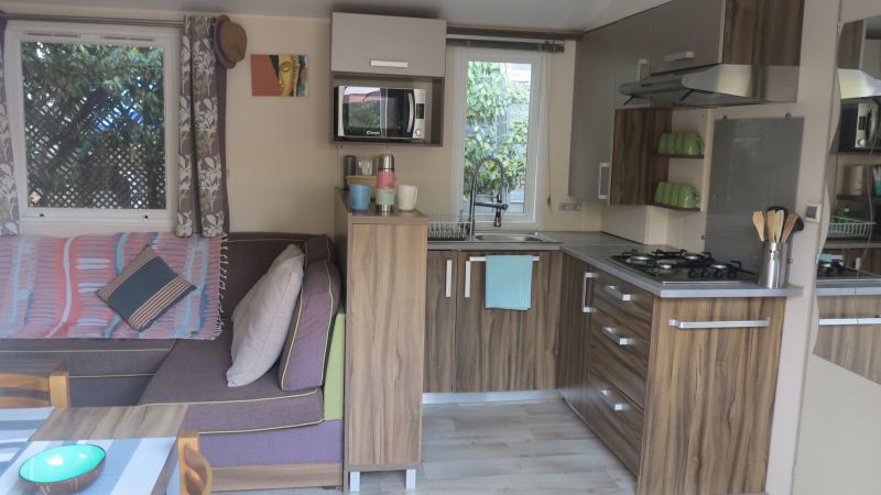 36m2 mobile home with a beautiful 55m2 terrace (18m2 for the largest bungalows on the campsite) with a pleasant outdoor lounge, a table that can accommodate up to ten guests, a gas barbecue, a plancha electric, 3 deckchairs, a top freezer useful for long stays, a very appreciable outdoor shower in the garden area. Fully equipped kitchen with 4 gas burners, complete crockery, fridge-freezer, microwave oven plus another microwave, nespresso machine, kettle, toaster etc ... Mobil-Home really very pleasant to live in privacy, quiet and without any vis-à-vis !!