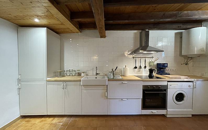 Moderna cocina, equipada con vajilla, menaje de cocina, vitrocerámica, microondas, lavadora, cafetera.