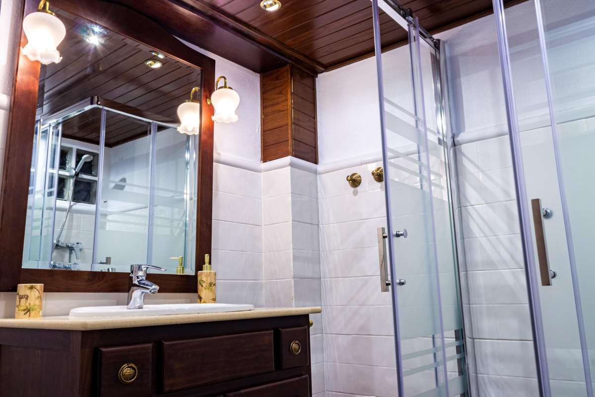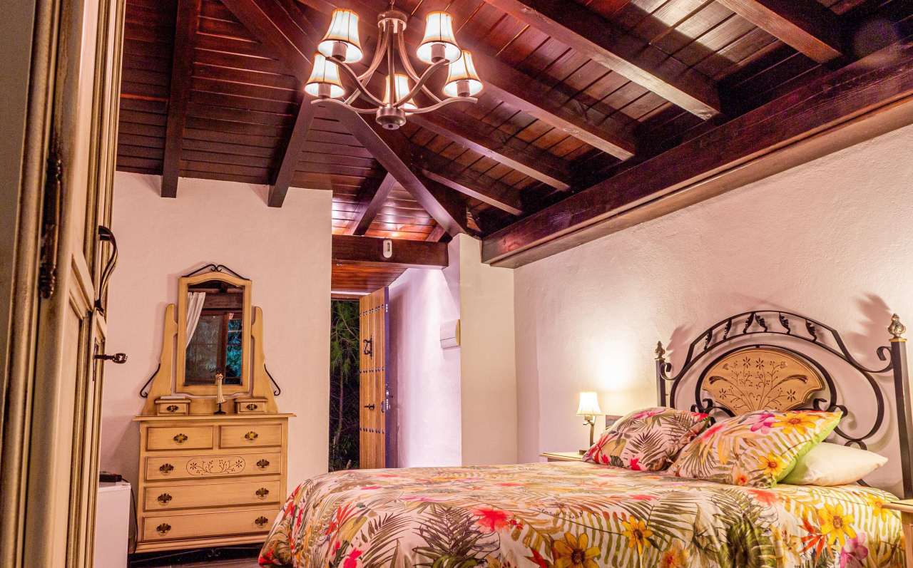 La casa cuenta con tres dormitorios, uno con cama de matrimonio en planta alta con bañera jacuzzi con iluminación cromática de led (posibilidad de dos camas individuales supletorias), otro en planta baja con una cama de matrimonio y otra doble individual, todas equipadas con amplios armarios.