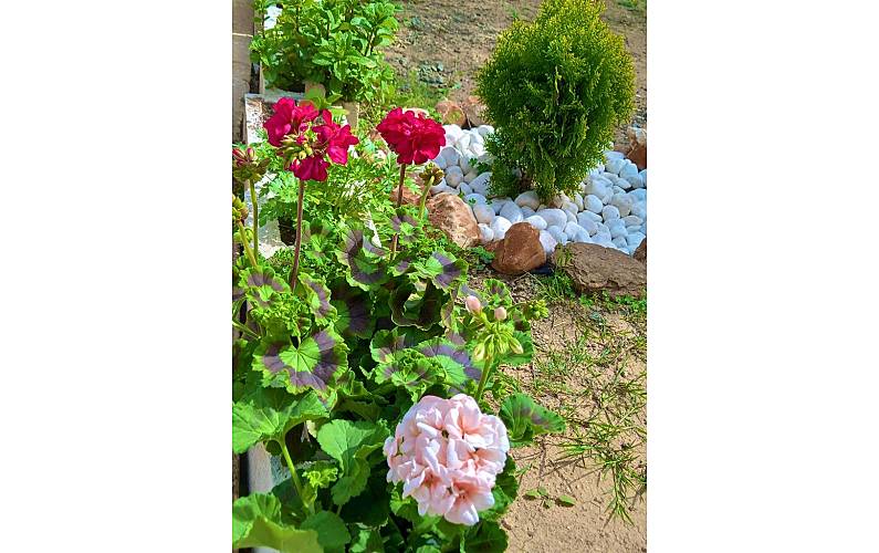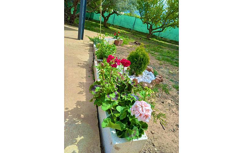 La vivienda esta vallada y en el jardín hay árboles y plantas.