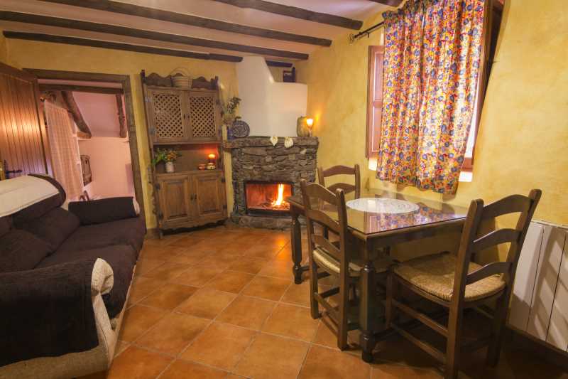 – Un cómodo y acogedor salón comedor con una bonita chimenea y sofá. Será vuestro perfecto refugio para los días más fríos, es un placer poder sentarse relajadamente en el sofá mientras ves el fuego de la chimenea.