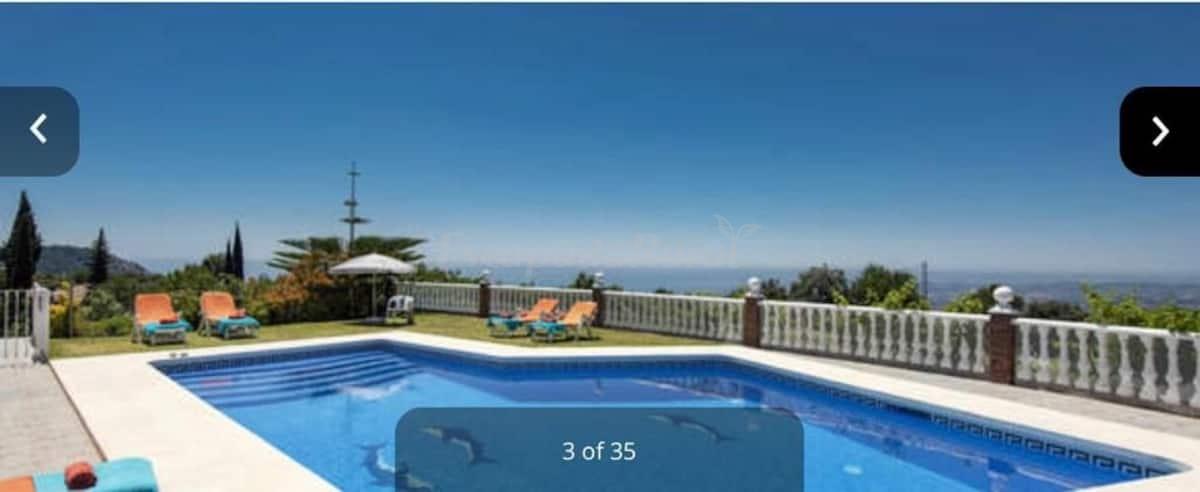 Villa is situated in an elevated position offering spectacular sea wiews from your own private pool. This spacious, countryside villa has 4 en suite bedrooms and a variety of seating and chill out areas, both inside and out. The local shops and restaurants in the charming village of Mijas are just 5 minutes away by car. A 10 minute drive will also take you to Cubana and Carvajal beaches.