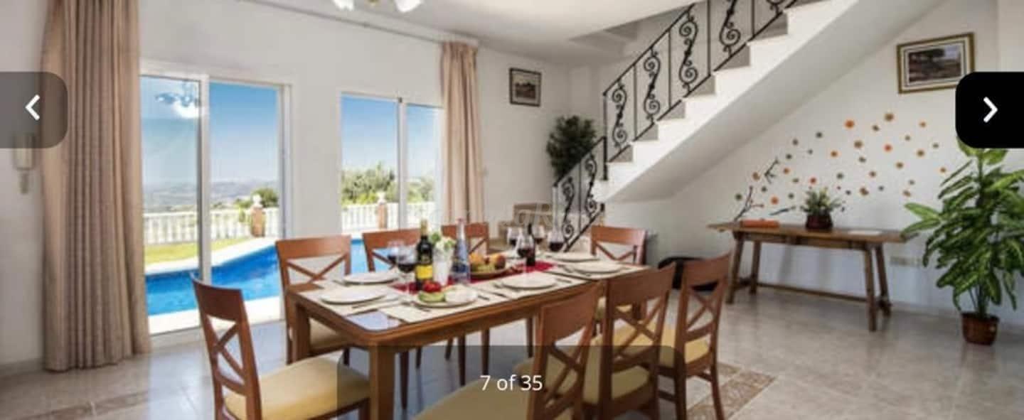 The front door opens directly into the lounge where there is comfortable seating and a flat screen TV. There are double patio doors leading out to the pool, meaning plenty of light floods the room, and allowing you to appreciate the pleasant views. The dining area is to one side of the lounge and to the other side there is a stairway leading to the first floor.