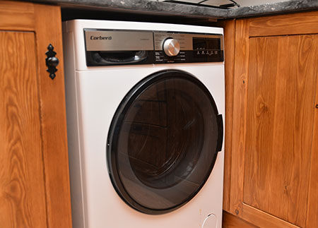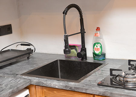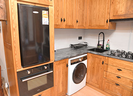 El espacio central de este apartamento turístico está destinado a la cocina y salón, que se ha dividido mediante un sofá cama. A un lado, la hermosa concina de madera totalmente equipada te enamorará gracias a sus detalles modernos como el horno y la encimera de gas, así como por sus detalles clásicos como una cocina económica de leña totalmente funcional.