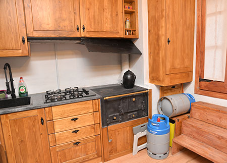 - Cocina totalmente equipada: nevera, horno y utensilios. Cocina de gas y cocina económica de leña