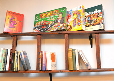 En este salón, en las estanterías, distintos juegos familiares nos ayudarán a pasar agradables ratos con la familia y amigos.