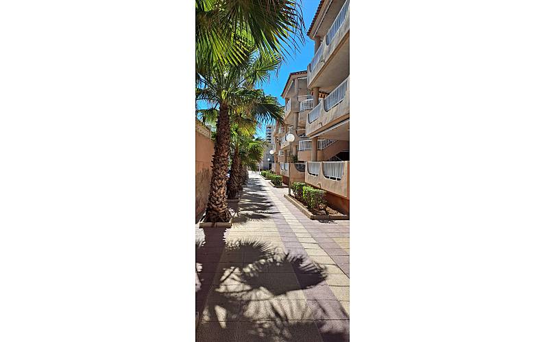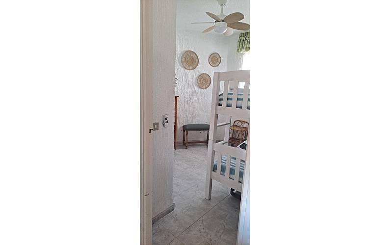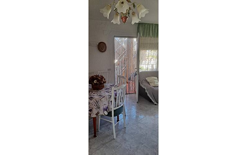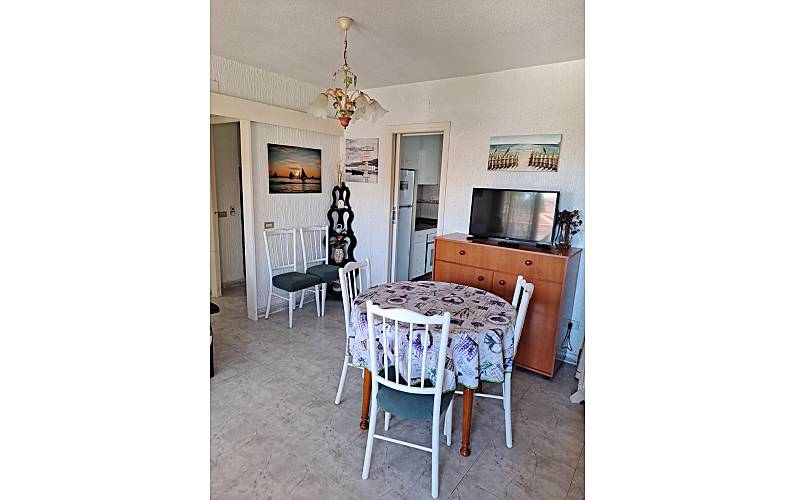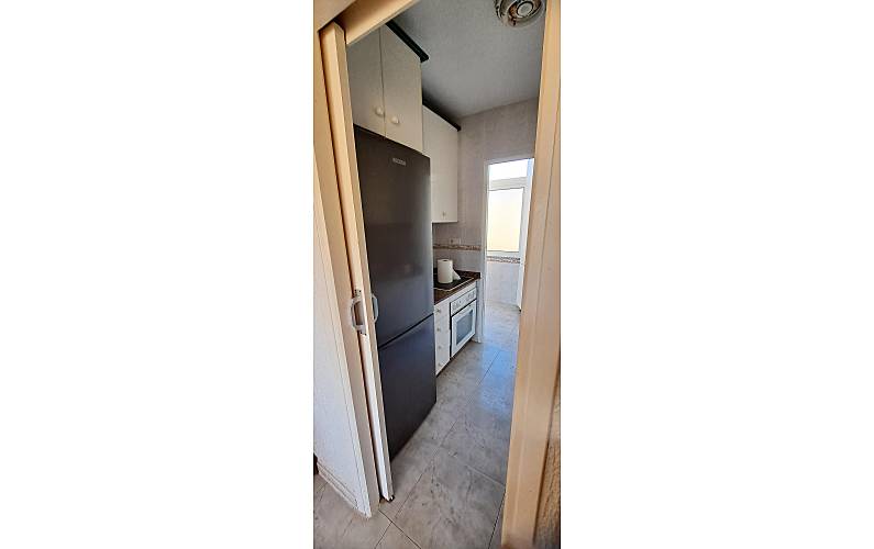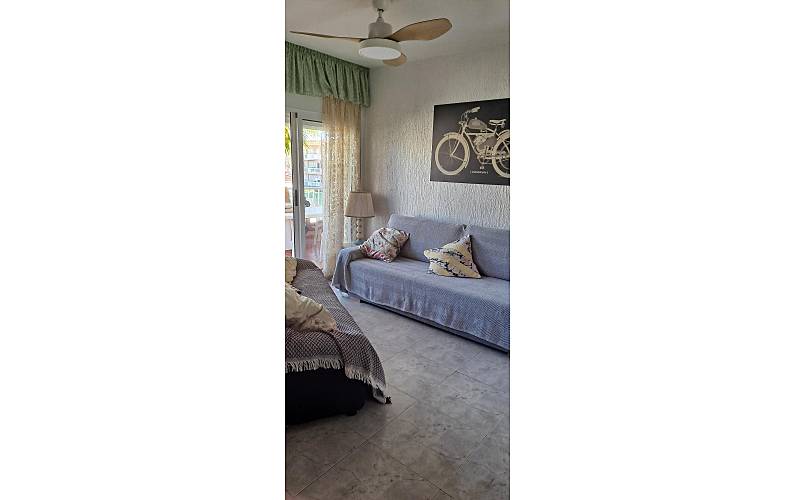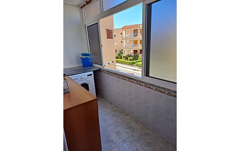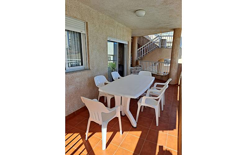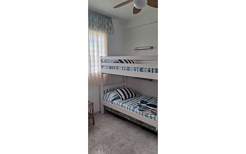 Apartamento de 2 habitaciones ,salón amplio cocina totalmente equipada y baño completo. Tiene 2 terrazas amplias una a cada lado del apartamento puesto que da a 2 calles donde corre el aire. Con ventiladores en el techo.Mesa para 8 personas en la terraza del salón y mesilla de mimbre con 4 asientos . Apartamento muy cómodo y fresco ideal para vacaciones de familia