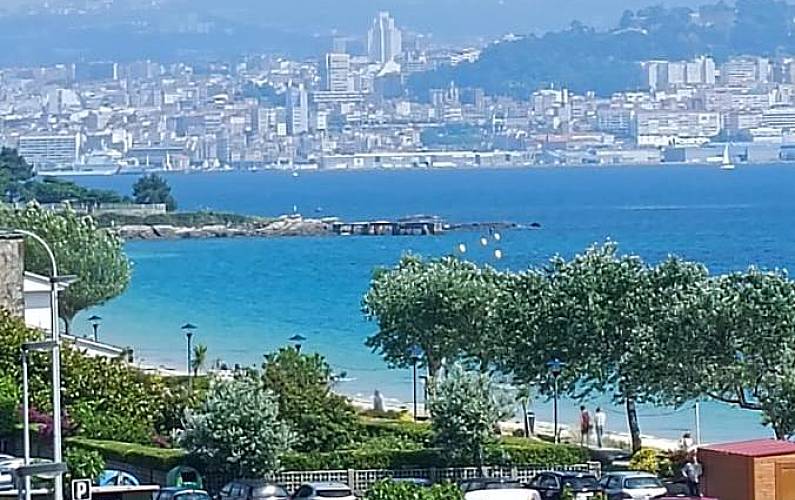 Como se puede comprobar en la foto desde el balcón, tiene vistas a Vigo y a la playa
