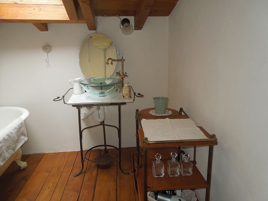 Always on the mezzanine is located the second bathroom, with a sink antique iron, (on which a time was placed a basin and a jug with water to wash, now readjusted with a sink glass definitely the most practical of the basin.), A bathtub with legs in the style of Louis XVI for romantic and relaxing baths, a toilet, this room also has a large window with a view of the sky and land.