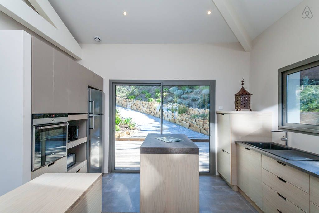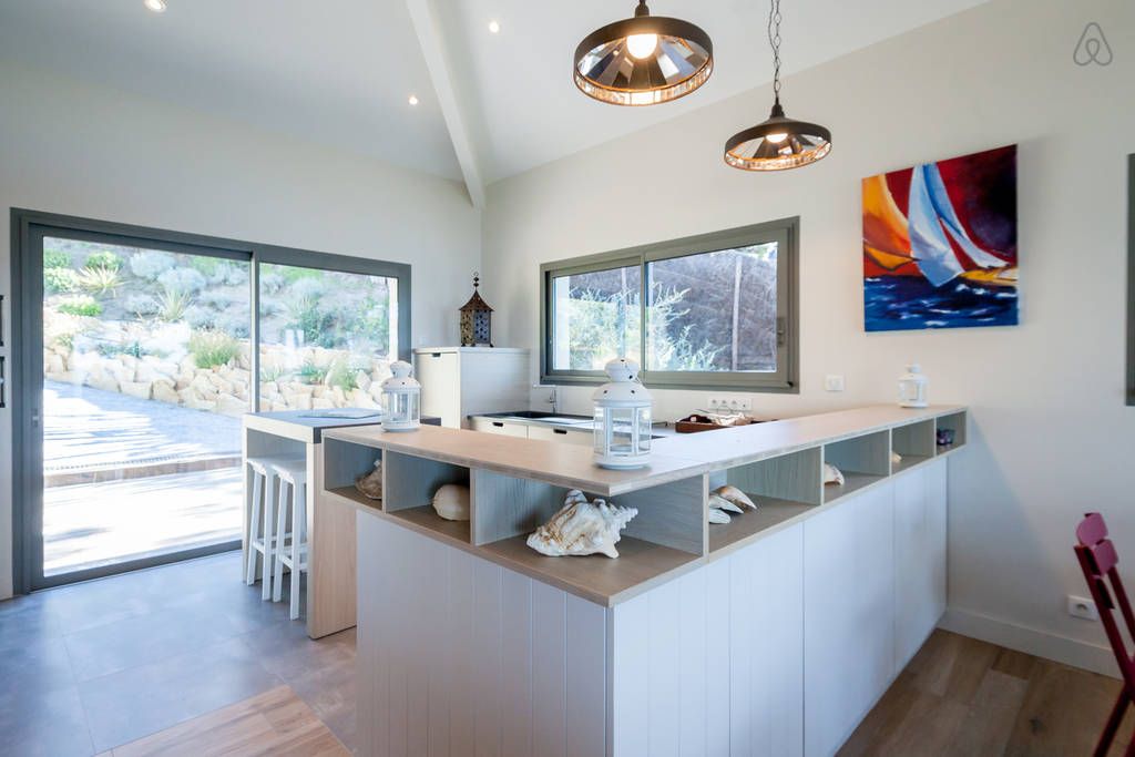 The entrance leads into a large room in L of 60 square meters, on the left with an American kitchen and living room facing the sea. This room opens onto a terrace facing the sea 40m2 for lunch / dinner outside enjoying the beautiful view. The master bedroom is also upstairs with dressing and bathroom with tub.