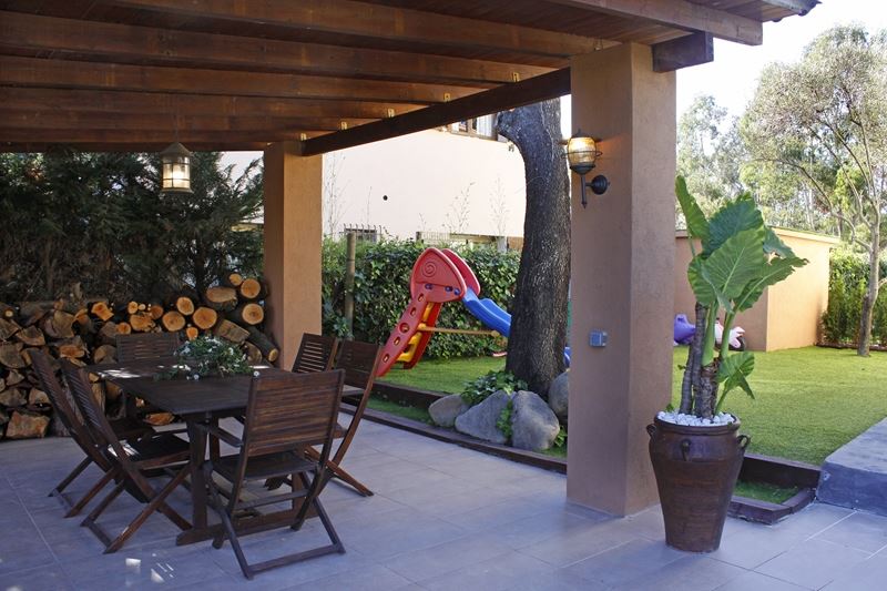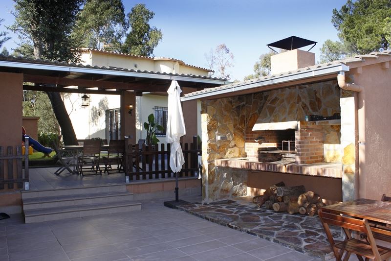 GRAN BARBACOA CON PORCHE ADECUADO A COMEDOR. ZONA CHILL OUT EN ZONA PISCINA, GRAN PISCINA CON ZONA PLAYA Y JACUZI.